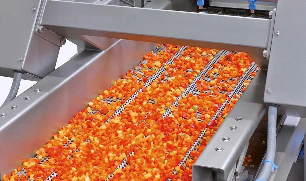 The flotation separation process enables products to be sorted during the washing process. It can be used for bell peppers and other products that can be sorted due to their flotation properties. The stem and unripe white parts of the product float on the surface of the water and are discharged via a special conveyor belt with a stainless steel link belt. Heavy parts (seeds and cores) sink to the bottom of the tank and are channeled out via the sand trap. The good product is distributed in the remaining water volume of the washing machine and then discharged via the vibration outfeed for further processing.