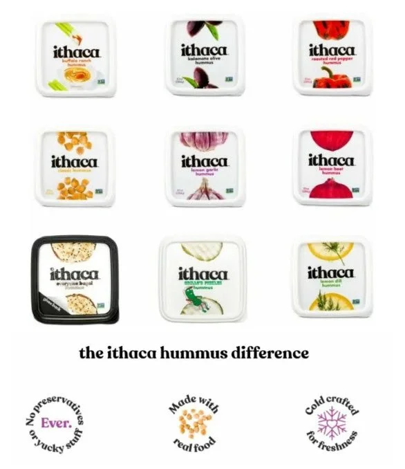 Ithaca uses all real ingredients in its products, such as chickpeas, cold-pressed lemon juice, tahini (sesame seed paste), raw garlic, cumin, and salt.