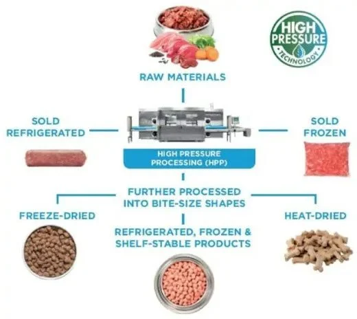 High Pressure Processing (HPP) is a technology that is becoming increasingly popular in the pet food industry for preserving raw pet food and treats. HPP uses extremely high pressures, up to 87,000psi. Harmful bacteria lose their ability to function and reproduce, reducing the risk of pathogens such as Salmonella and Listeria in the final product. This is crucial for pet owners who prefer to feed their pets raw food but are concerned of food safety.