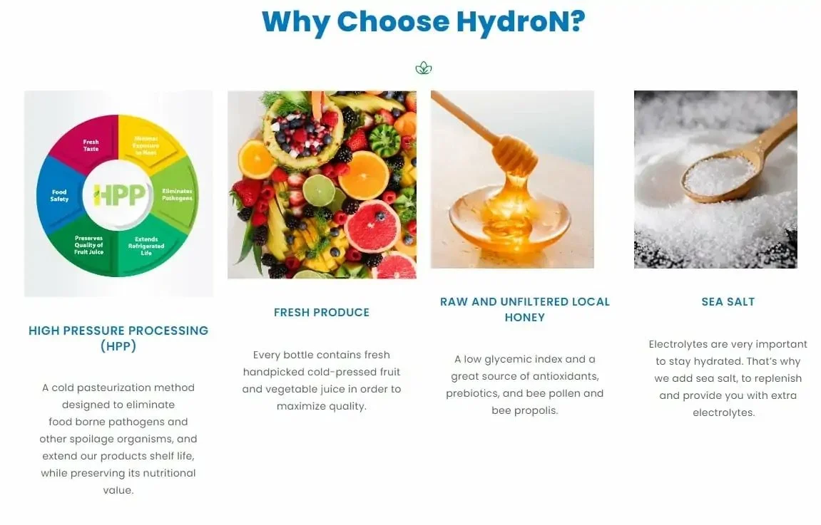 A: At demo’s we verbally educate consumers of all the benefits of HPP highlighting how this process increases shelf life without compromising quality, nutritional value and safety. On our website, under “Why choose HydroN” we designed a diagram showing the benefits of High Pressure Processing.