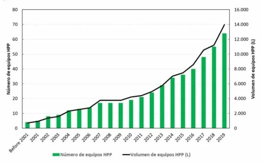 The expansion of the HPP avocado market is reflected in the number of equipment installed worldwide, which has experienced exponential growth since the early 2000s. Today, it is estimated that companies processing avocado products sum up to 60 HPP systems and a volume of 14,000 liters, representing more than 300 million kg of HPP avocado per year. Global avocado consumption grew at an annual rate of 4% in the period 2010-2020. In particular, the HPP-processed avocado products sector was the fastest expanding sector with an annual rate of 14%, which is consistent with equipment installations around the world.